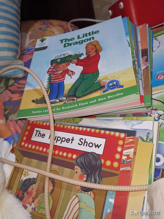 我家学的是苏博士系列的英文绘本,牛津树英文绘本和海尼曼系列英文绘本,一摞是学过的,枕头边的是没学过的,另外我给她看的课外书是这么厚一本格林童话,我以为她看不下来,她居然能看懂,也能读出来,而且还能说出一个故事一个故事的意思,挺好的,这个看完再给她一本365夜童话故事看看??